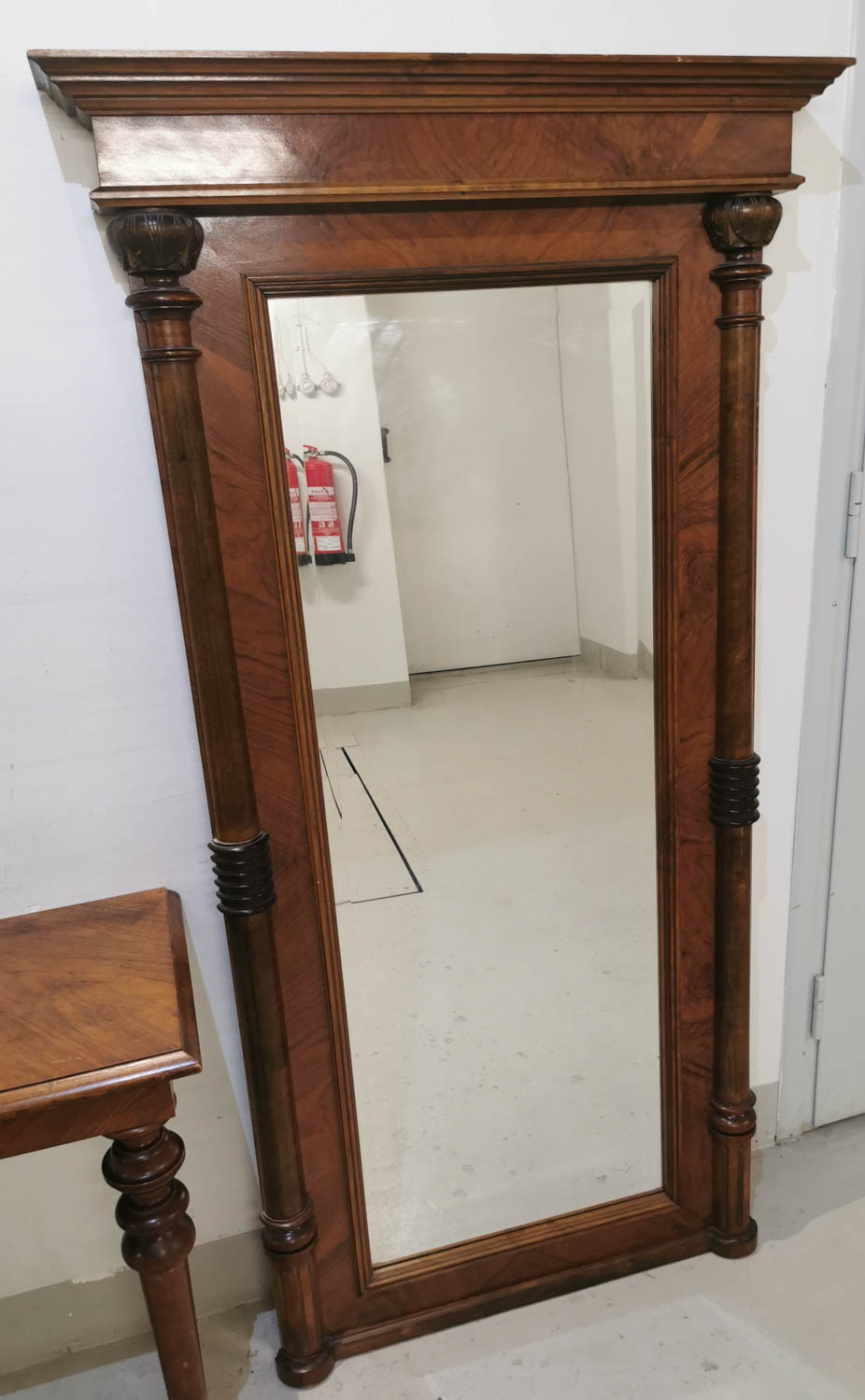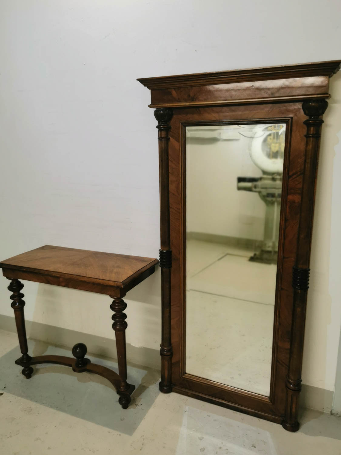 Pähkinäpuinen peili + trymå, Uusrenesanssi, noin 1890-luvulta, peili, 85 x 162 cm, Trymå 80 x 38 cm korkeus 74 cm