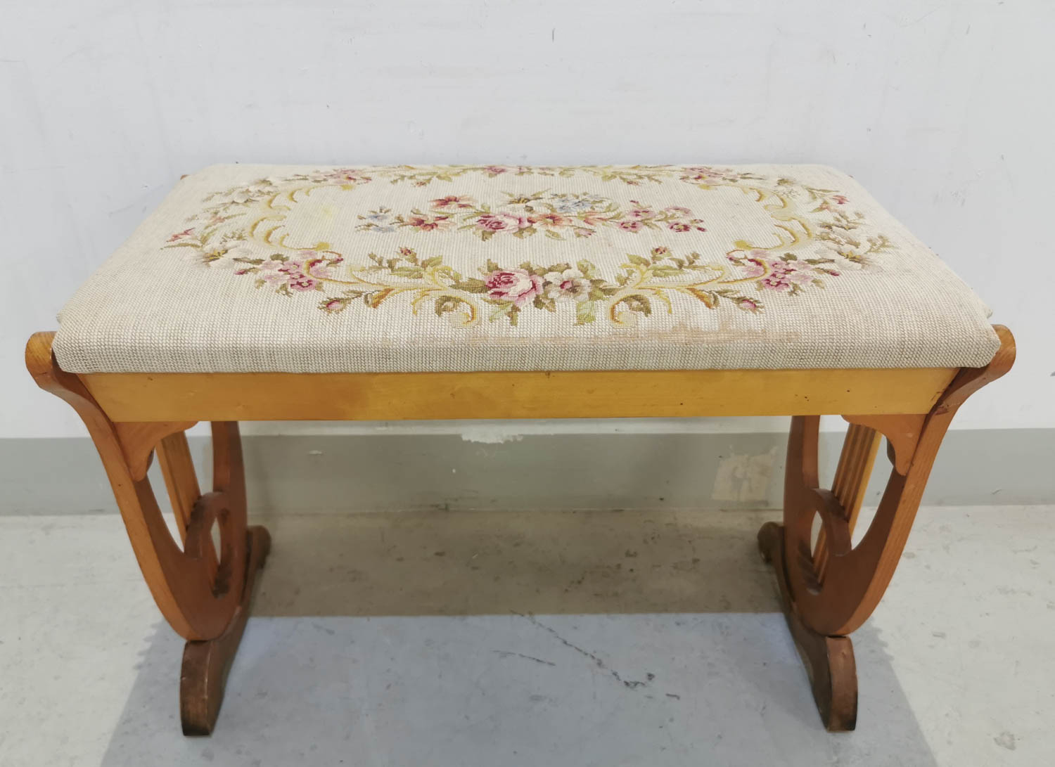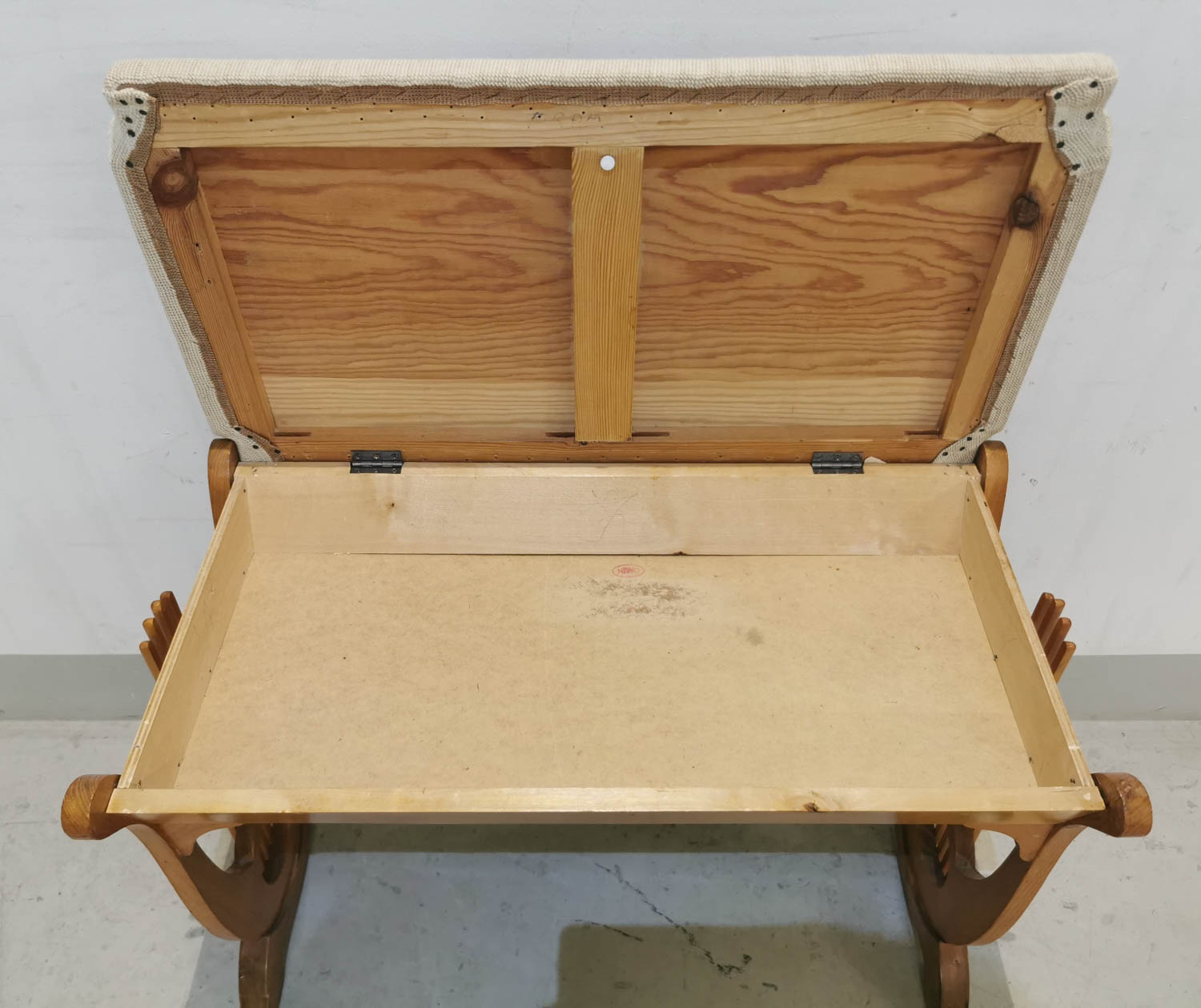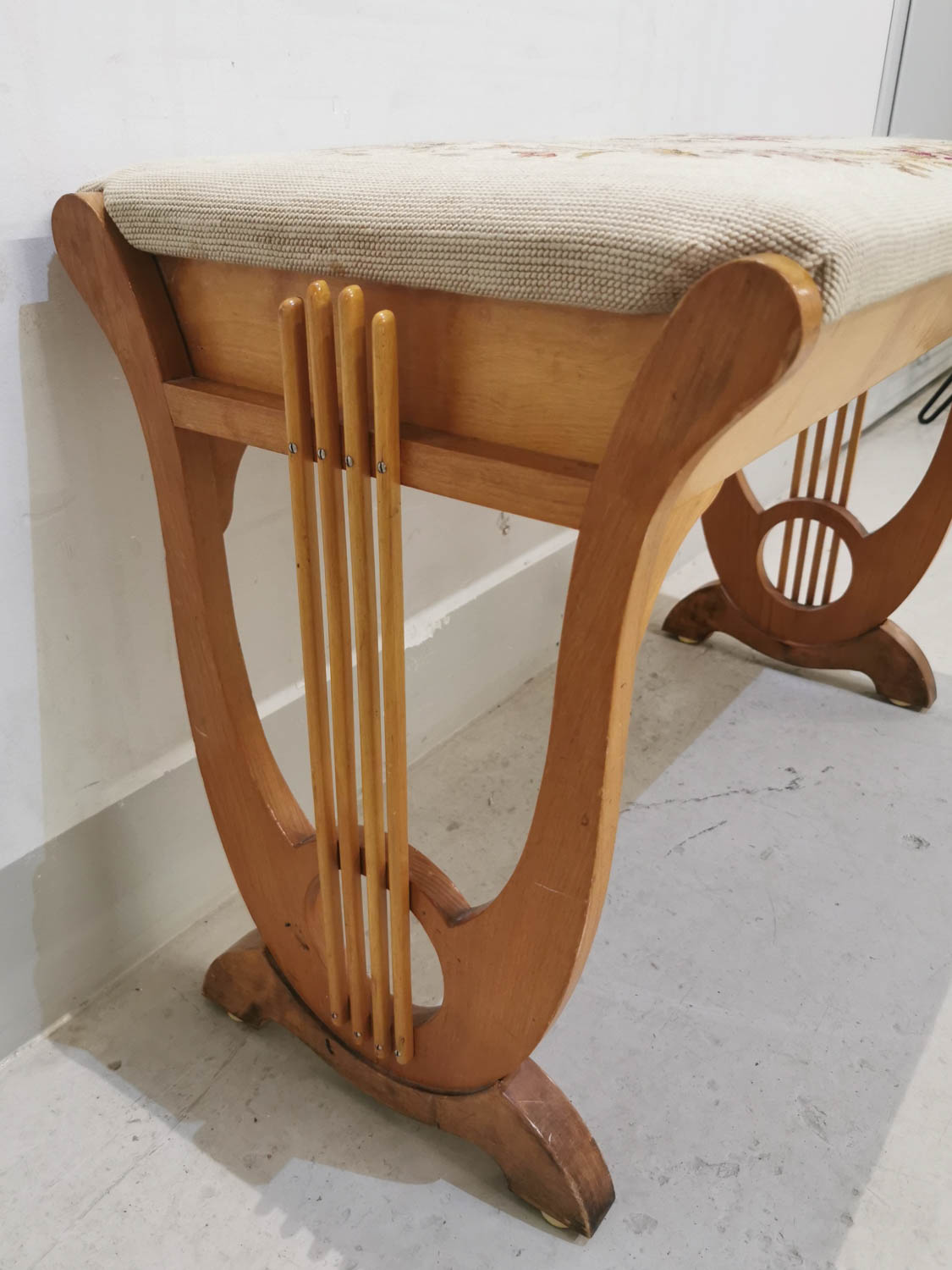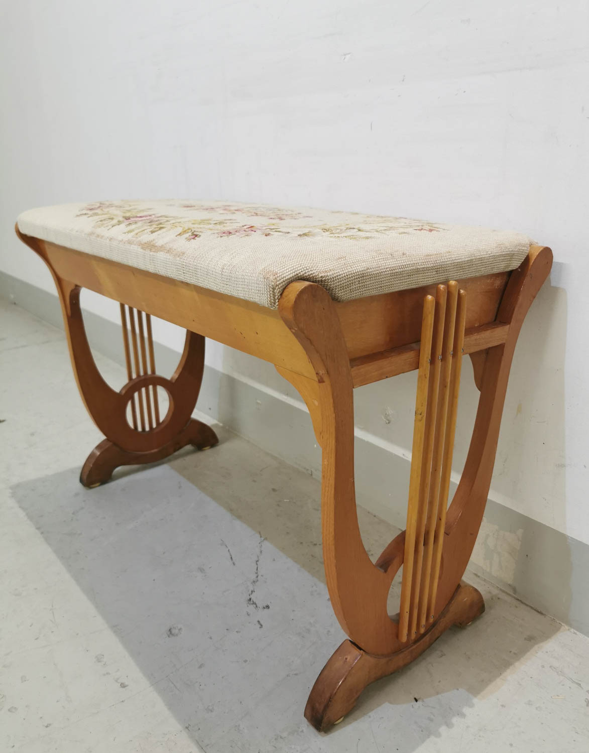 Pianorahi, käsinommeltu istuinverhoilu, 1940-luvulta, saranoitu kansi, 70 x 38 cm korkeus 51 cm