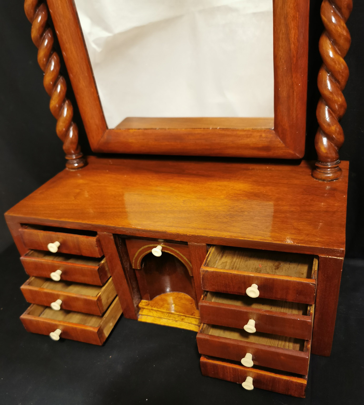 Ns. Piianpeili, 1800 luvun lopulta, pieniä laatikoita 9 kpl, kauniit kierrepylväät sivuilla, 40x19cm korkeus 63cm-