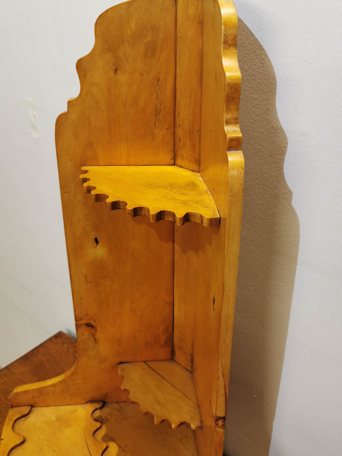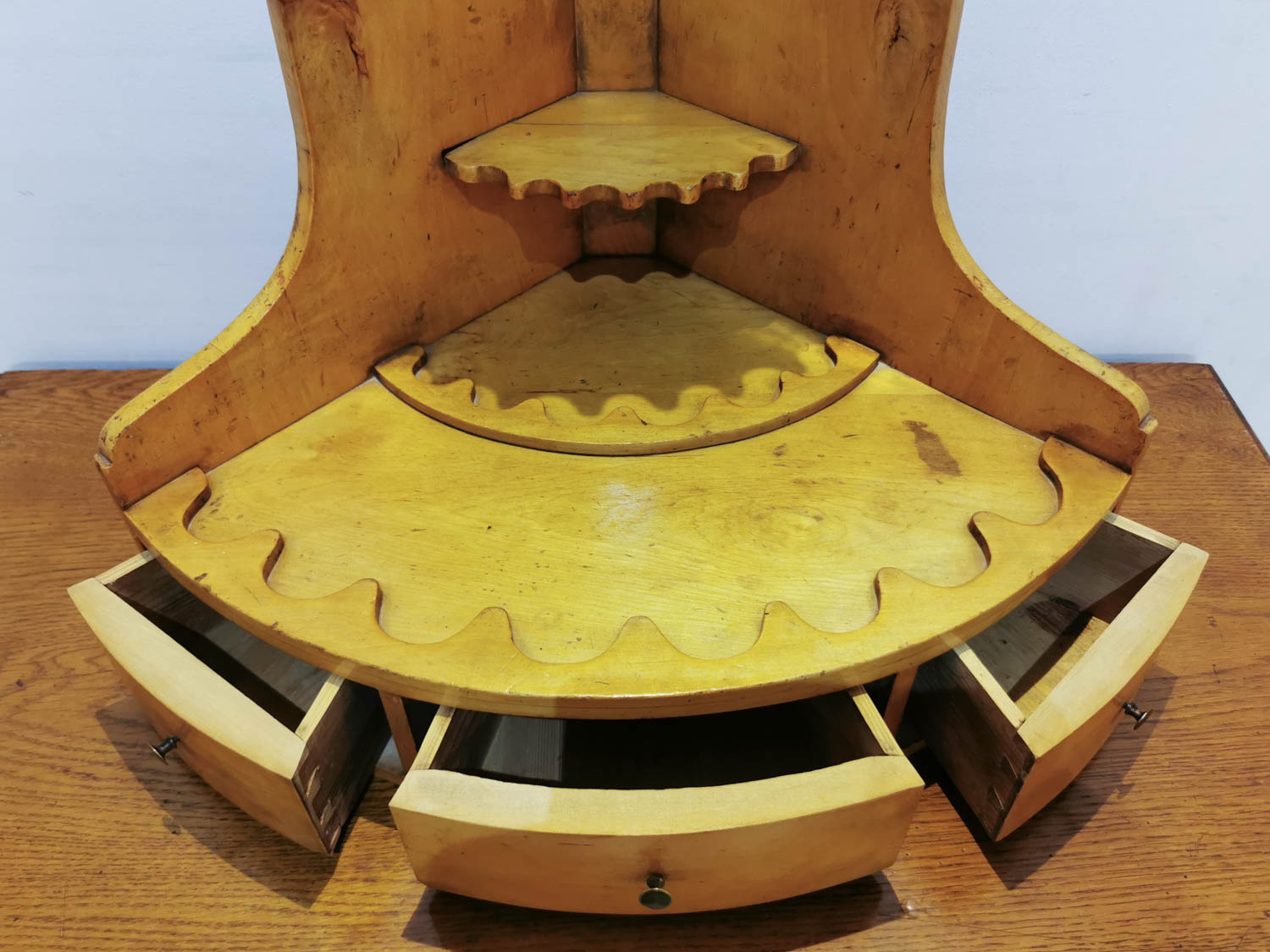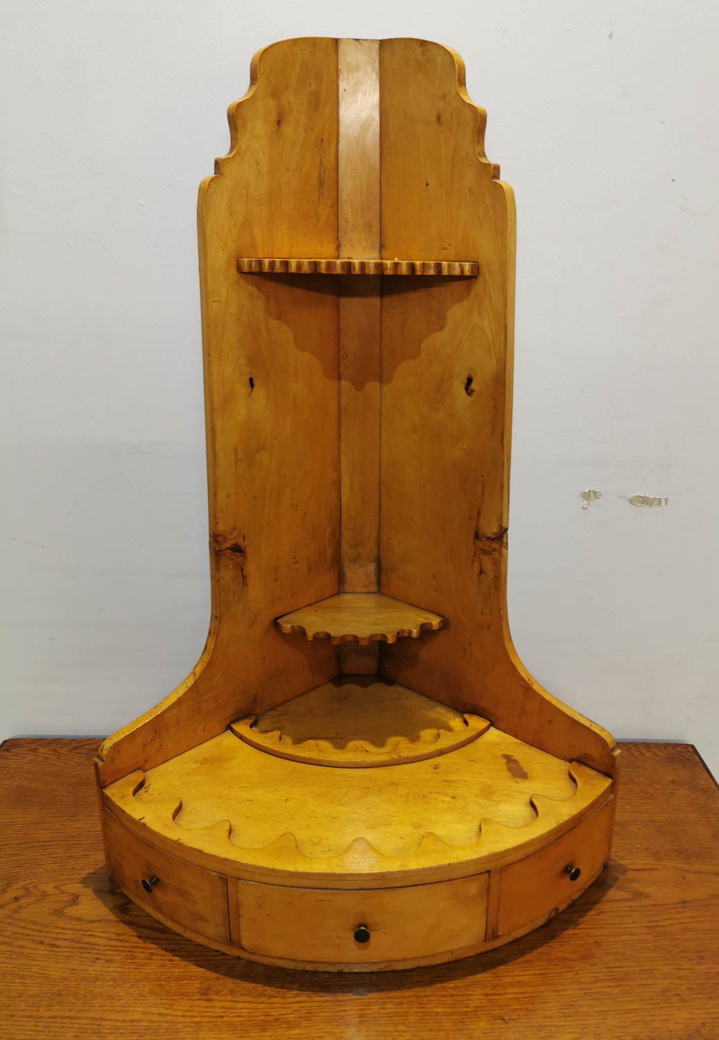 Koivuinen kulma piippuhylly, kolmella laatikolla, 1900-luvun alkupuoli, korkeus 80cm leveys 50cm, pitkille ja lyhyille piipuille tilaa.