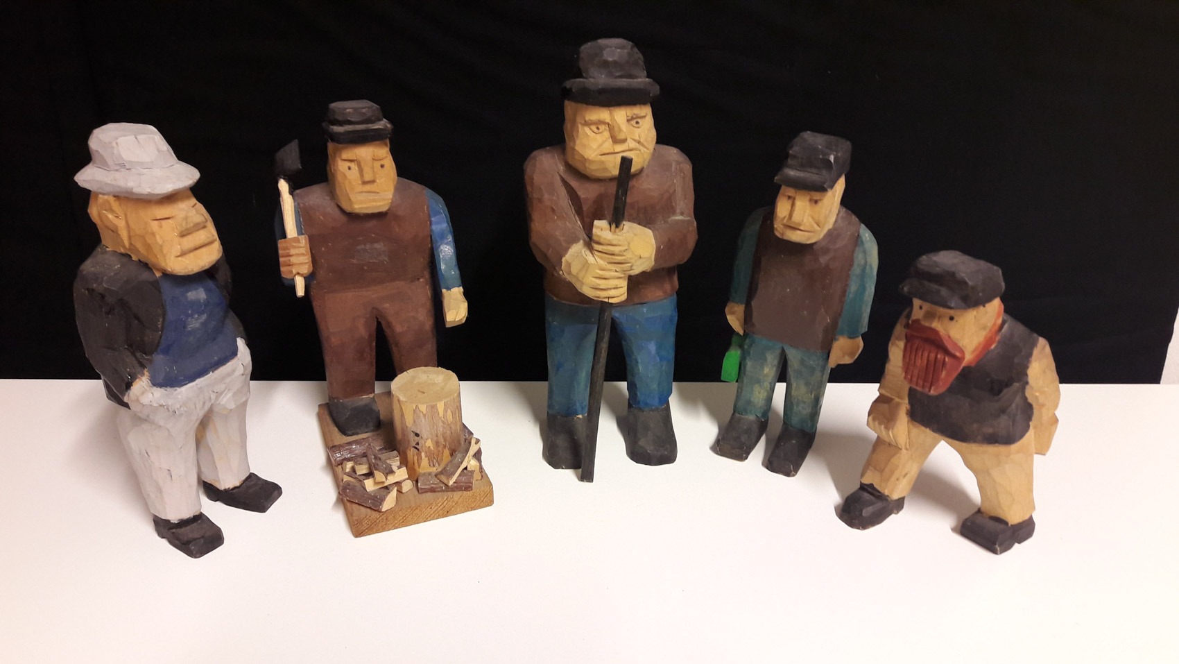 Vanhat käsinveistetyt puiset ukot, hinnat 49-75€ kpl korkeus 22cm – 14cm