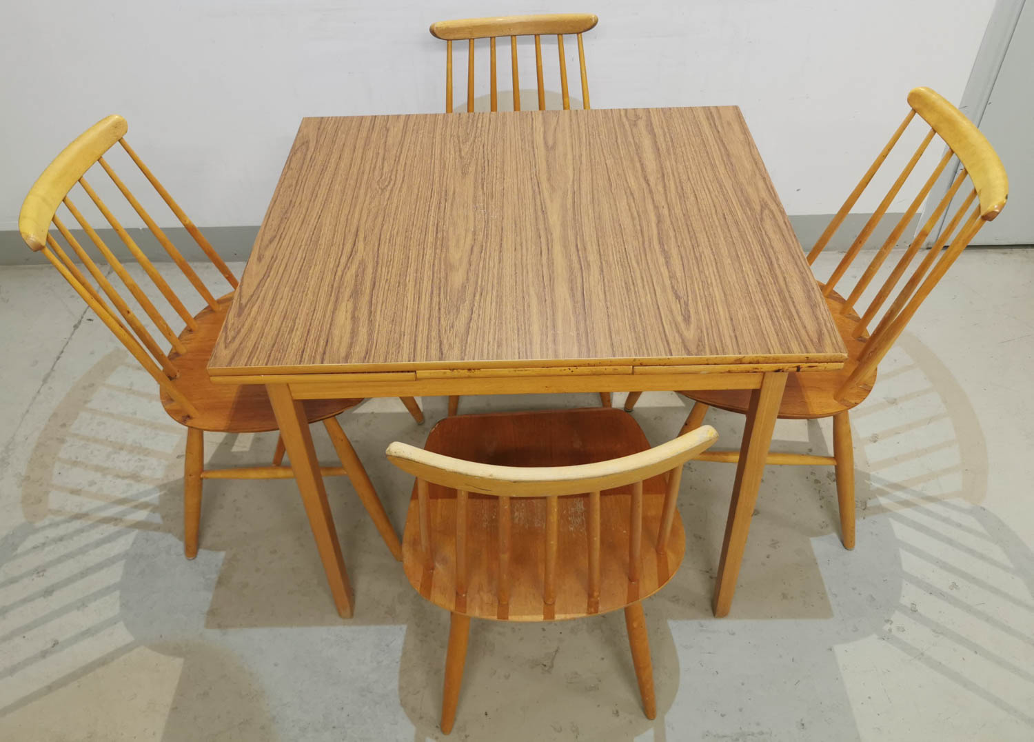 Jatkettava ruokapöytä 1960-luvulta, tuolit myydään erikseen, katso osio Tuolit. Pöydän mitta, 90 x 75 cm korkeus 74 cm, jatkopalat 2 x 29 cm