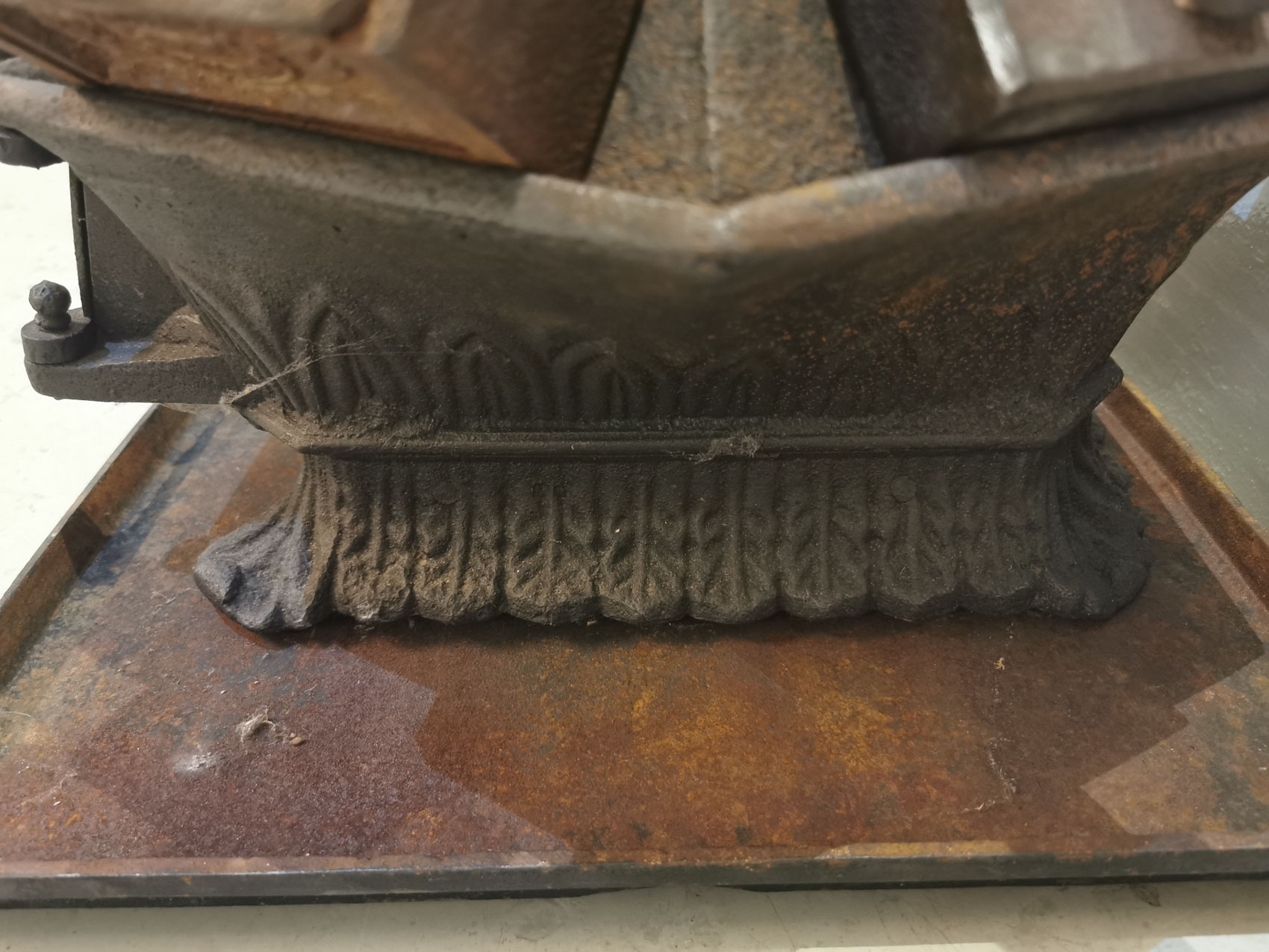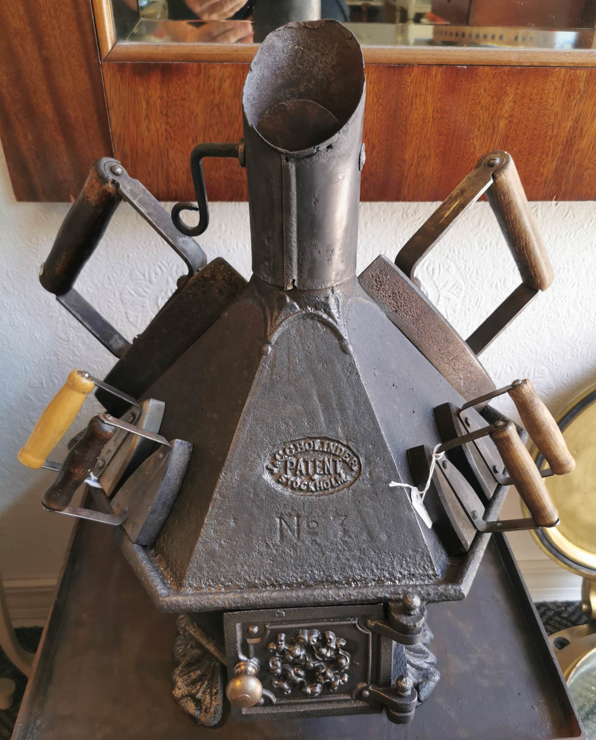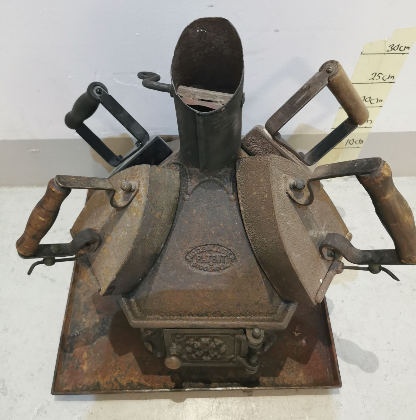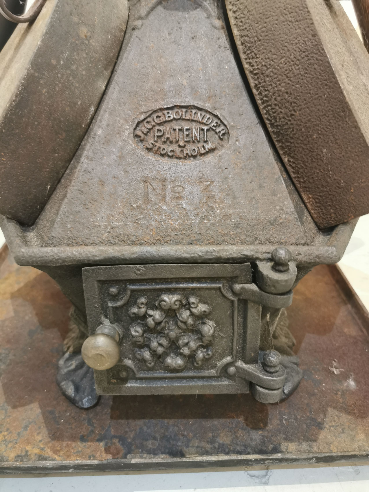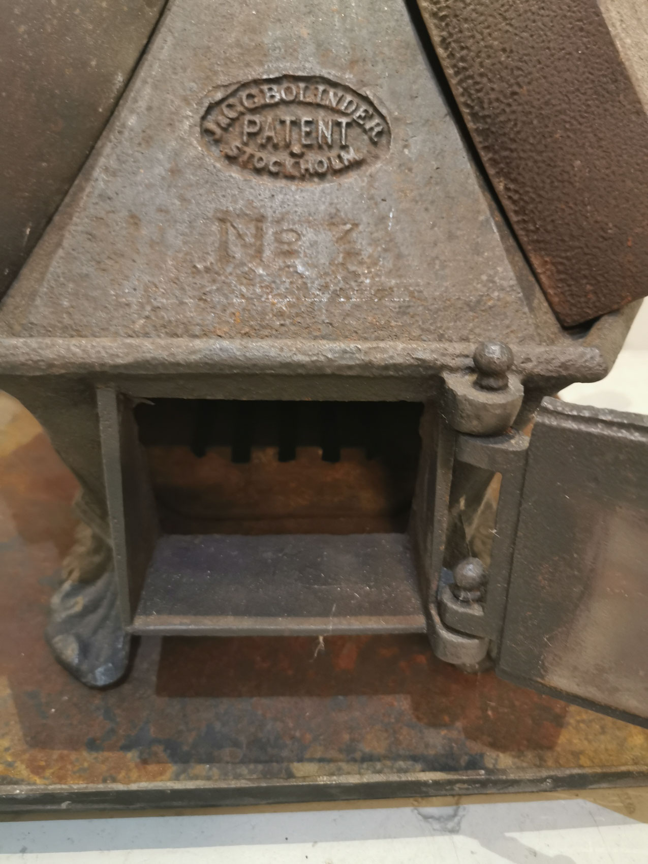 Räätälin silitysraudan lämmitysuuni, 1800-1900-luvun vaihde, sopii 6kpl silitysrautoja kerralla, teräksinen pohja-alusta, 43 x 40cm korkeus noin 50cm