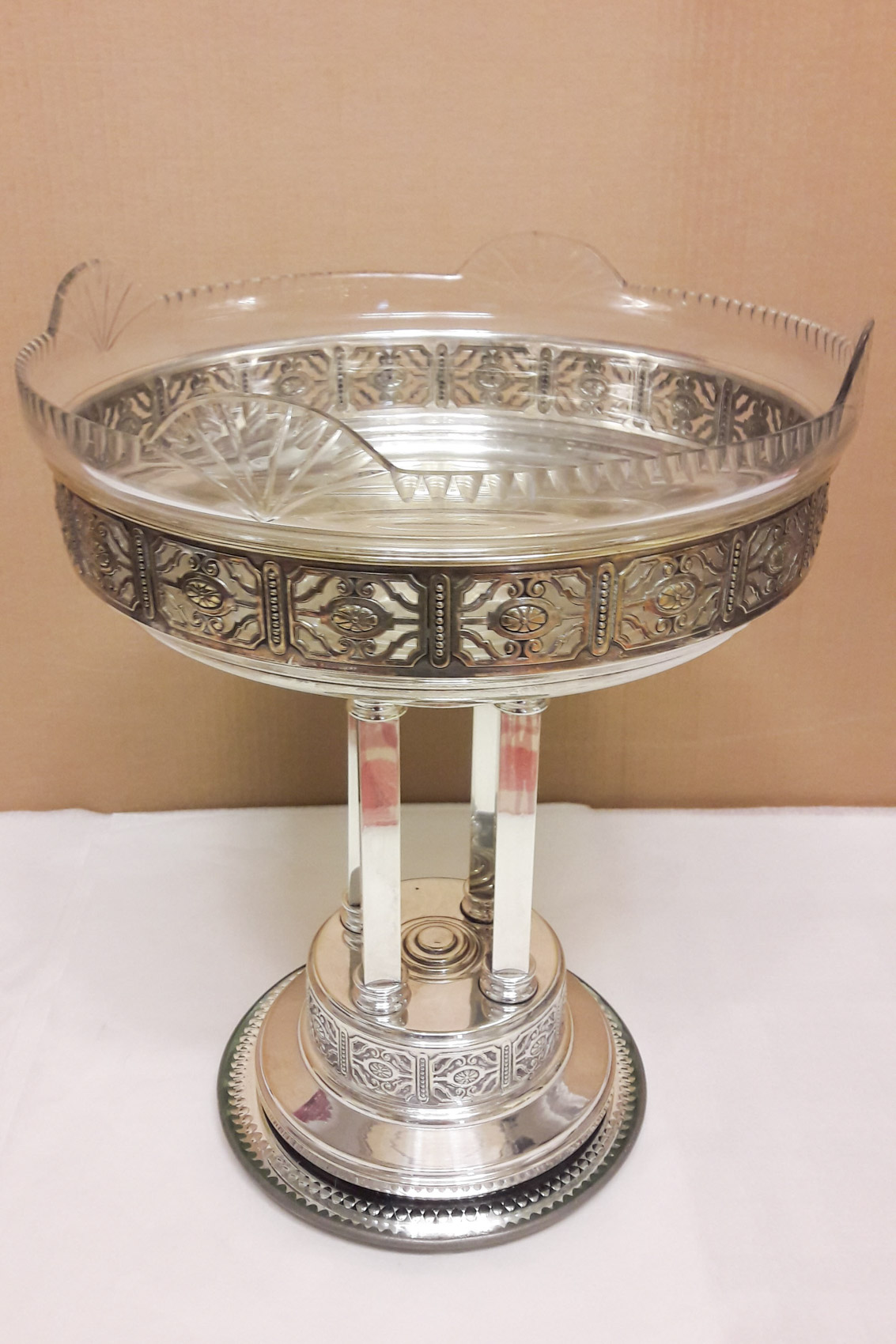 Uushopeinen tarjoiluastia, sisäosa hiottu kristallia, aivan 1900 luvun alku,