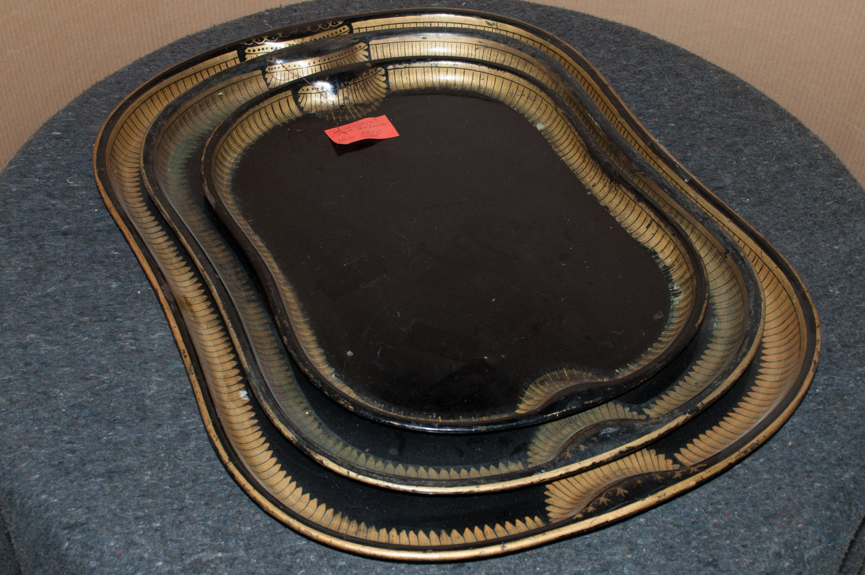 Upea tarjotin sarjaa 1800 luvulta 3 kpl, mustia tarjottimia