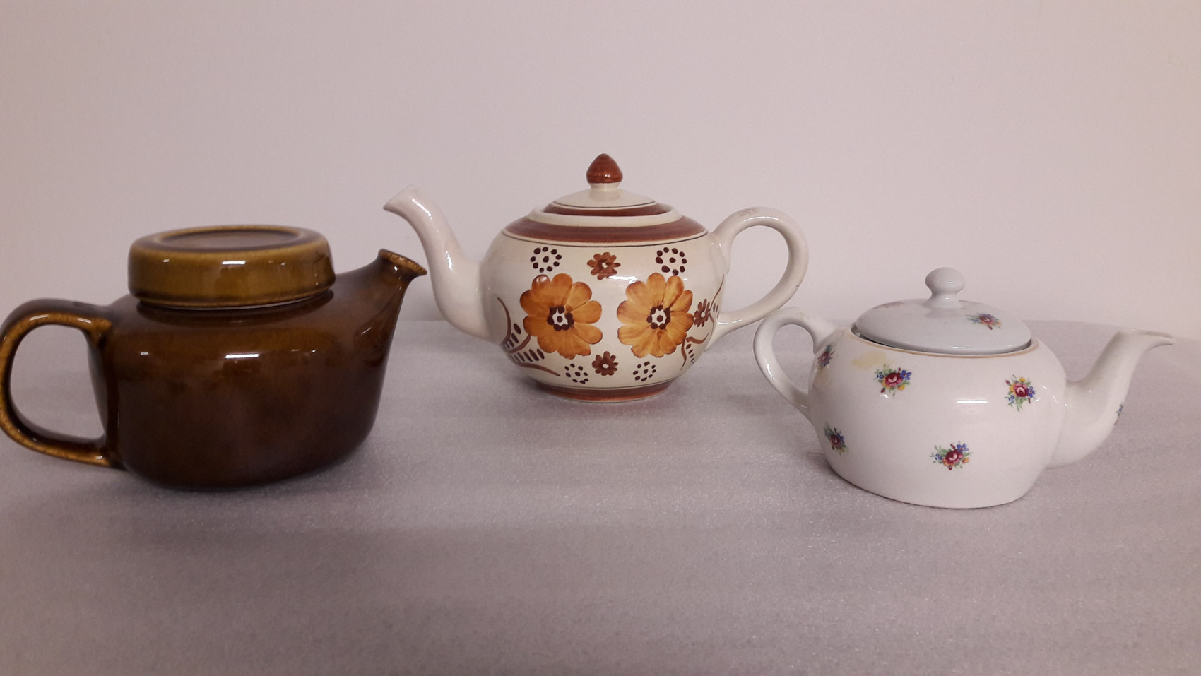 Teekannuja 3 kpl, Arabia ruskea, sekä pieni vaalea kukallinen, kolmas Kupittaan saven valmistama. Ruskeassa myös porosihti, pienessä teipin jäänteet. Myydään kappaleittain, alkaen 35€ kappale.