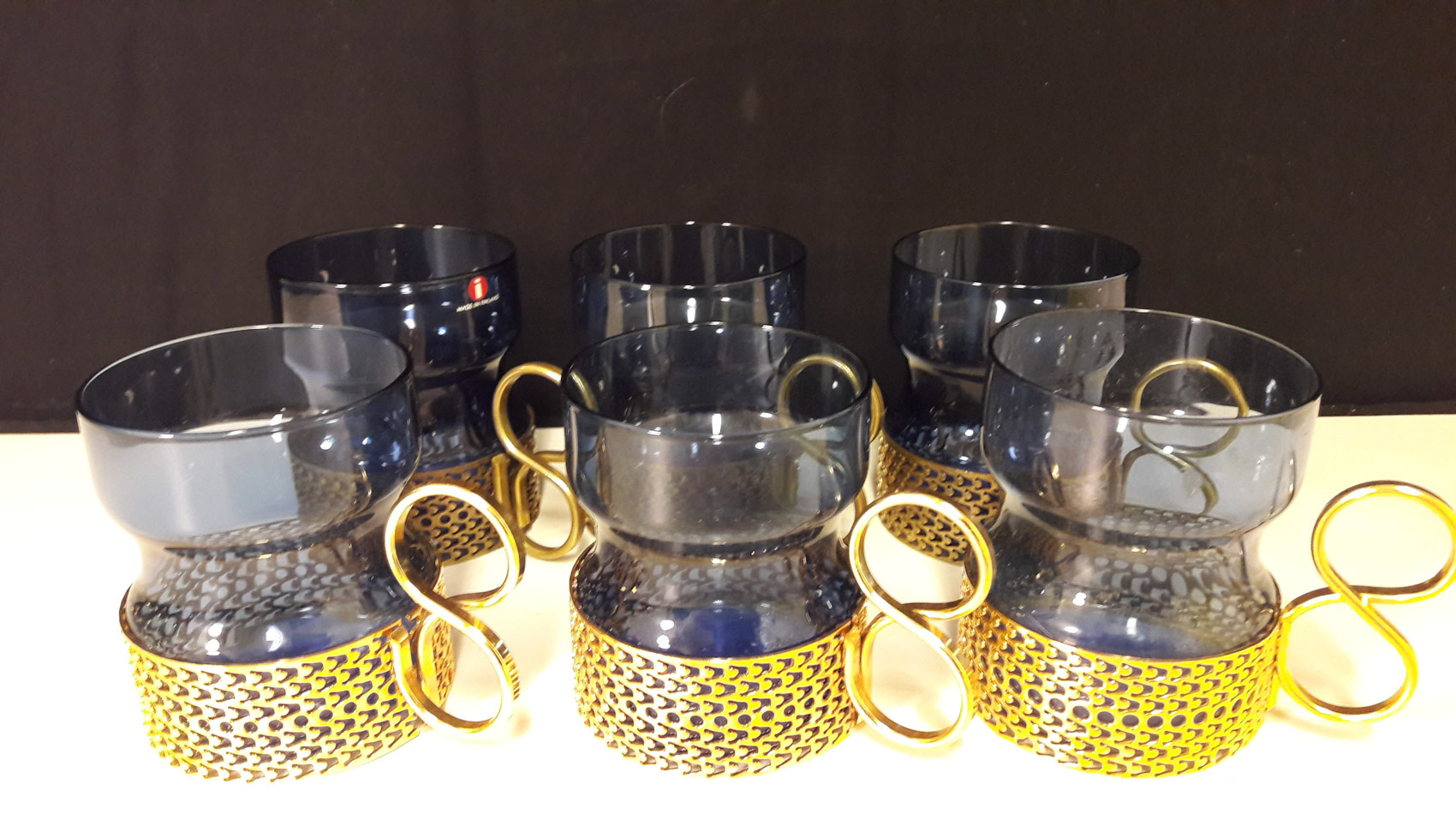 Glögilasit, Tsaikka, siniset, kultaiset pidikkeet, 8 kpl, Timo Sarpaneva, Iittala, 30€ kpl.