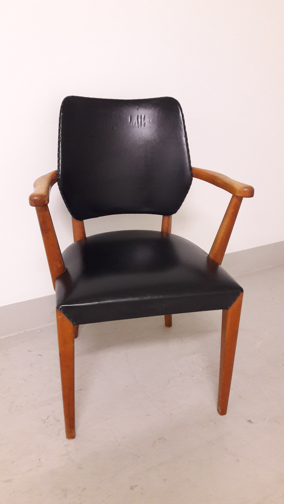 Käsinoja tuoli, 1960 luvulta keinonahkatuoli, alkuperäinen siistin kuntoinen, Kork 44/85cm istuin lev 58cm