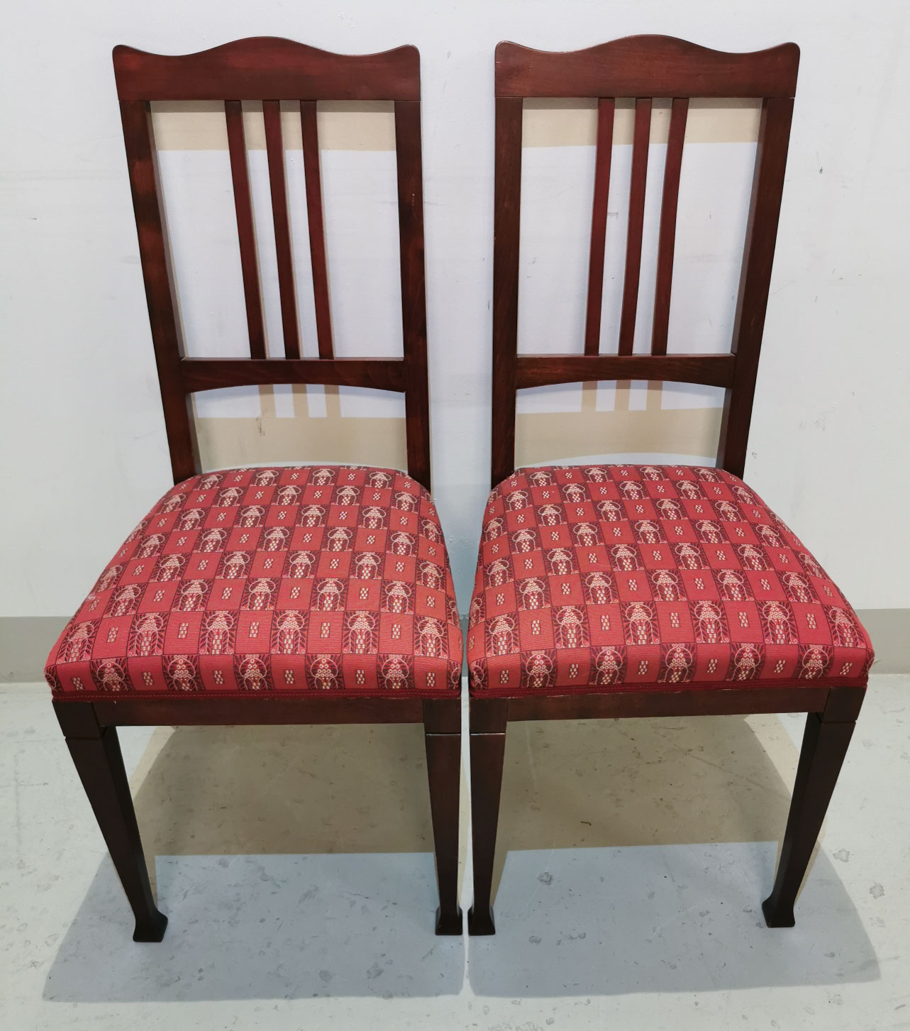 Jugend tuoli pari, kunnostettuja kokonaan, upealla punaisella jugend kankaalla.