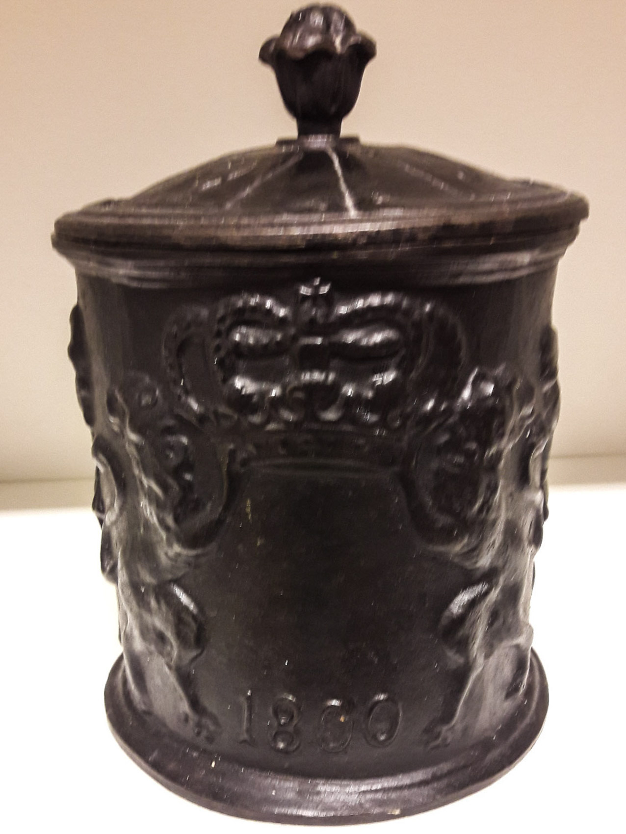 Valurautainen kannellinen tupakka-astia vuosiluvulla 1800.