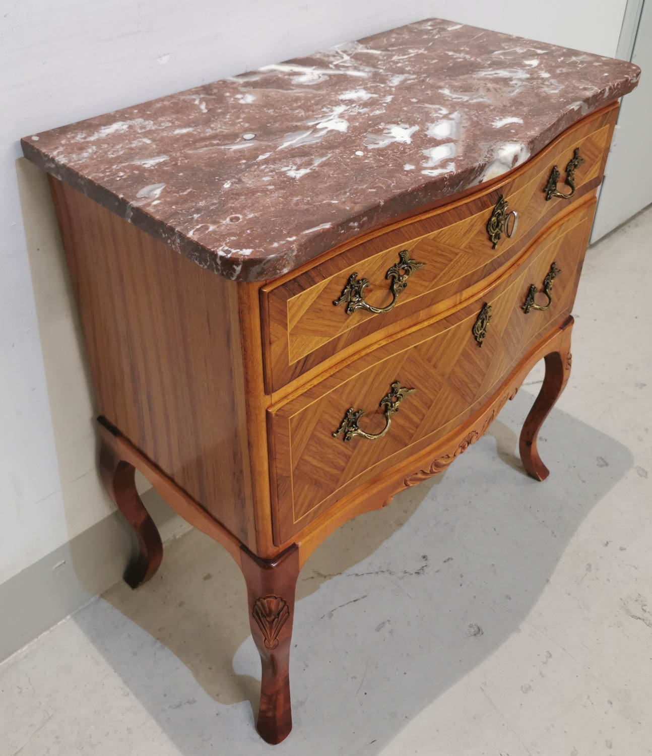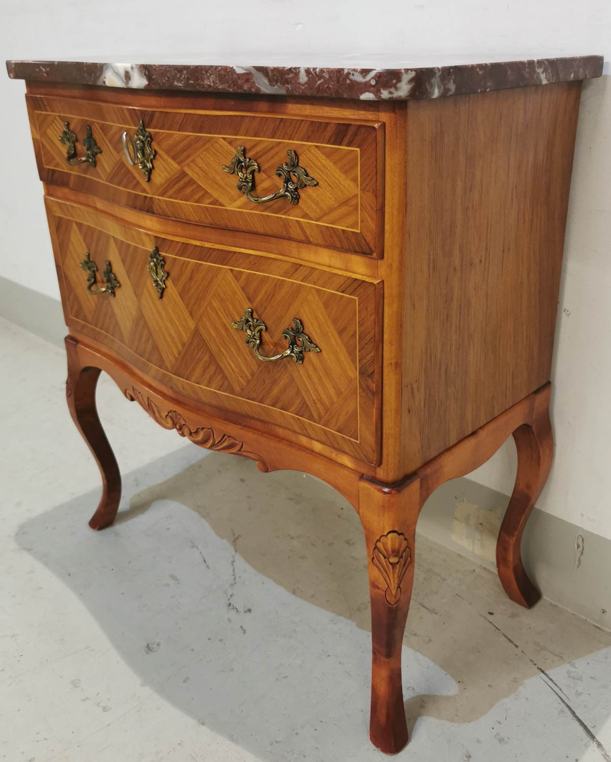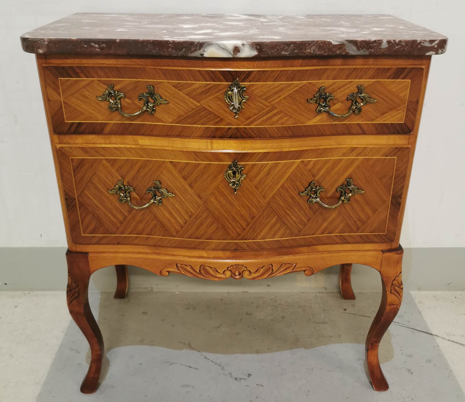 Rokokootyylinen pieni lipasto marmorikannella, noin 1950-60 -luvulta, lukolliset laatikot 2kpl, 62.5 x 34.5cm korkeus 69cm