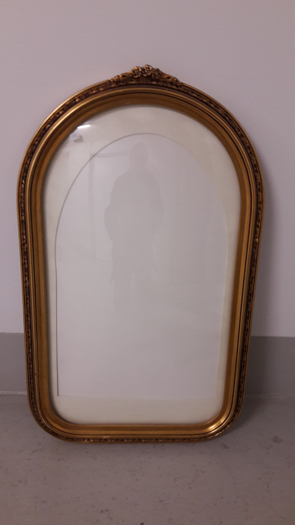 Puinen ja kullattu, 1920 luvun valokuvakehys, kupera ja puhallettu lasi, 33x55cm.