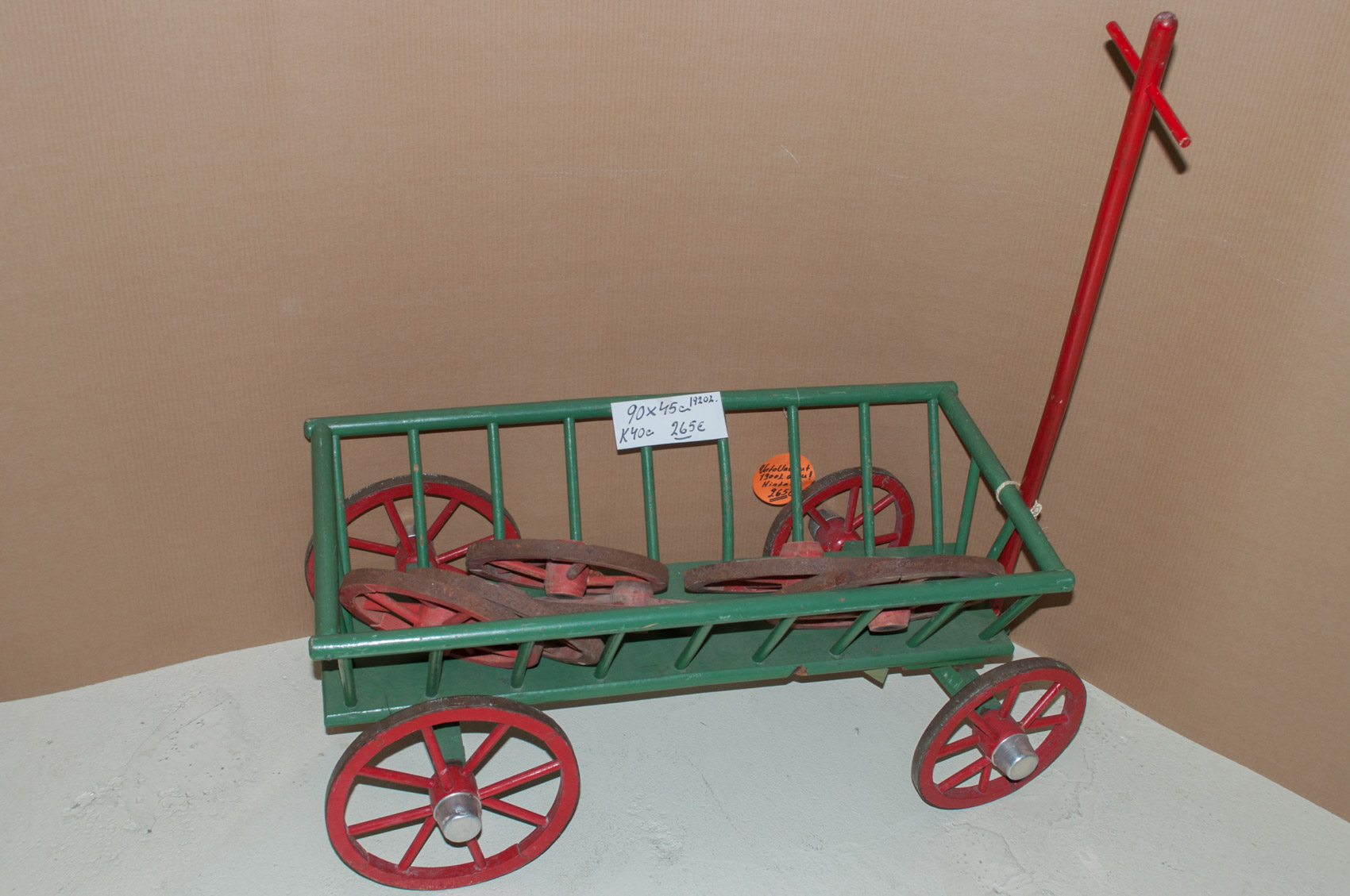 Vetovaunut 1900 luvun alku, puiset pyörät, ja vetoaisa, vihreä ja punainen