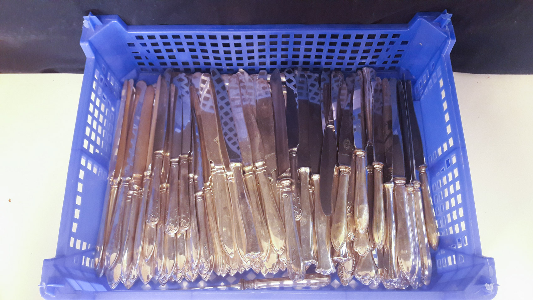 Uushopeiset ruokailuveitset, 1900 luvun alku, myös muita ruokailuvälineitä runsaasti, 8€ kpl