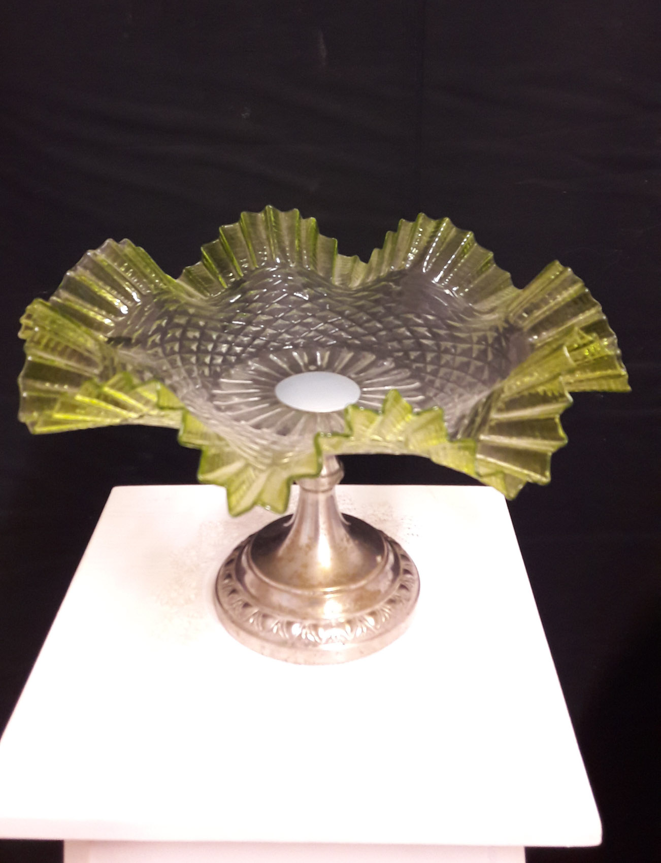 Vekkilasimalja 1800-luvulta, uushopeinen jalusta, ehjä ja siisti malja.