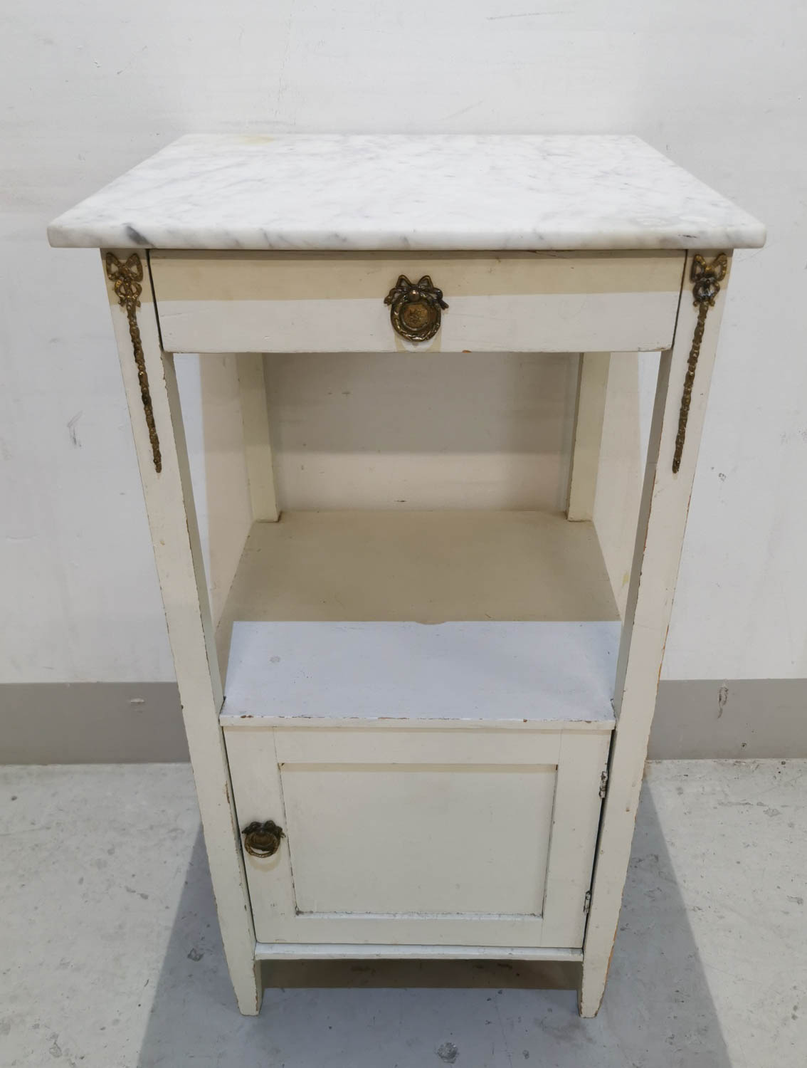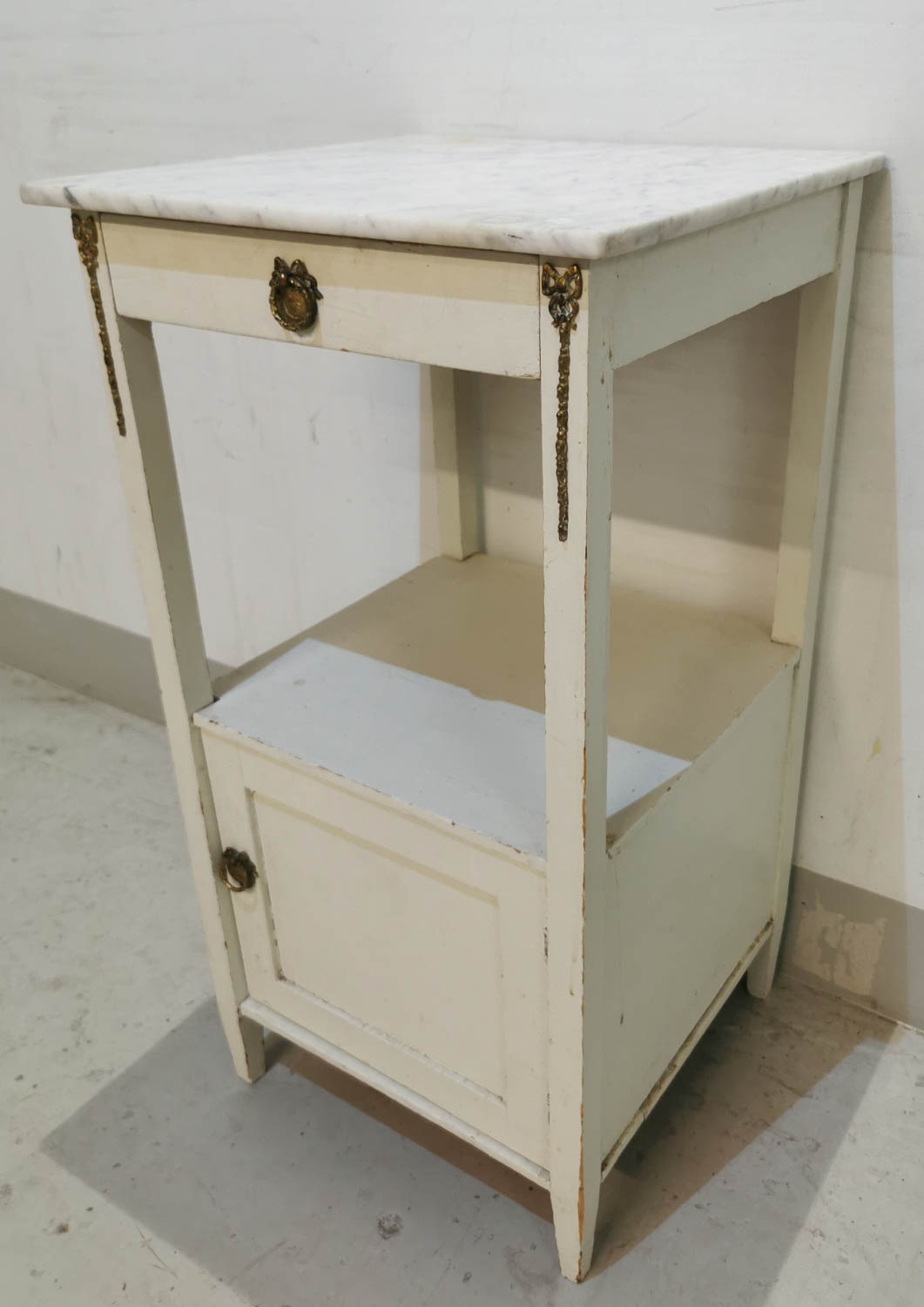 Yöpöytä, marmoritasolla, 1900-luvun alku, laatikko sekä kaappi, messinkiset koristeet, 40 x 40 cm korkeus 74.5 cm.